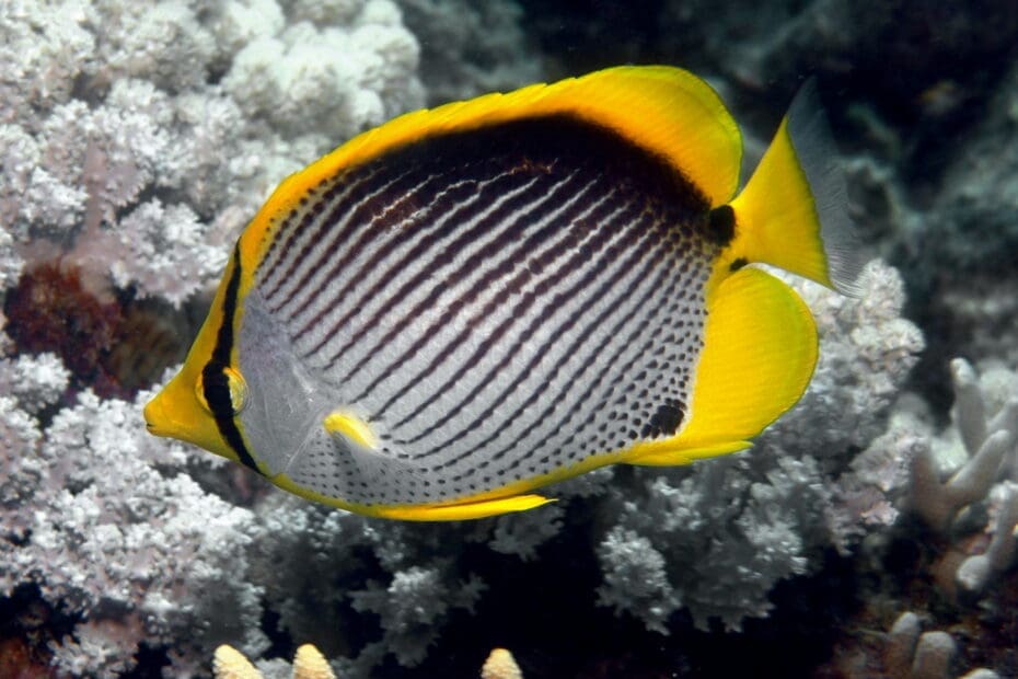The Blackback Butterflyfish features a white body adorned with diagonal black lines and a prominent black patch along its upper back. Its face, belly, and fins are highlighted in yellow, with a distinctive black eye band. A black saddle on the caudal peduncle further distinguishes this species.