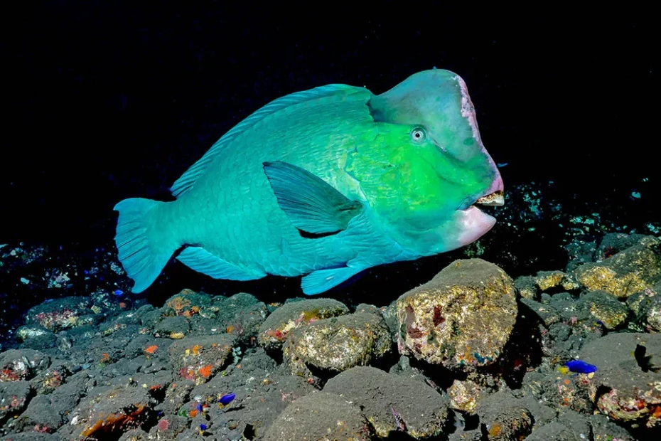 This species is a major bioeroder, consuming large amounts of coral and excreting fine sand. A single Green Humphead Parrotfish can produce over 100 kg of sand per year, contributing to reef sediment formation.