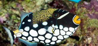 The Clown Triggerfish is one of the most strikingly patterned marine fish in the hobby. Its bold black body is decorated with large white polka dots on the lower half, while the upper portion features a yellow and black leopard-like pattern. The mouth is ringed in bright yellow, and a yellow band runs behind the eyes. This eye-catching coloration helps it blend into coral rubble in the wild while also making it a centerpiece in aquariums.