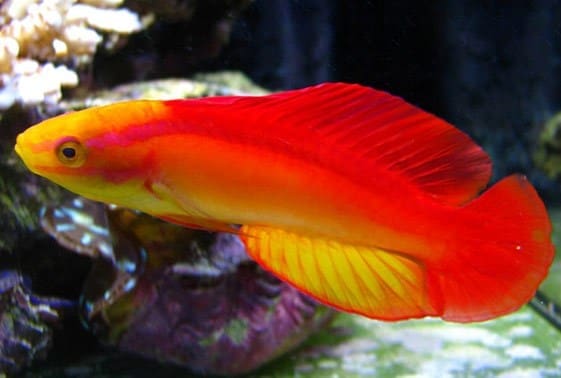 The Flame Fairy Wrasse is renowned for its vibrant and striking appearance, exhibiting notable sexual dimorphism: