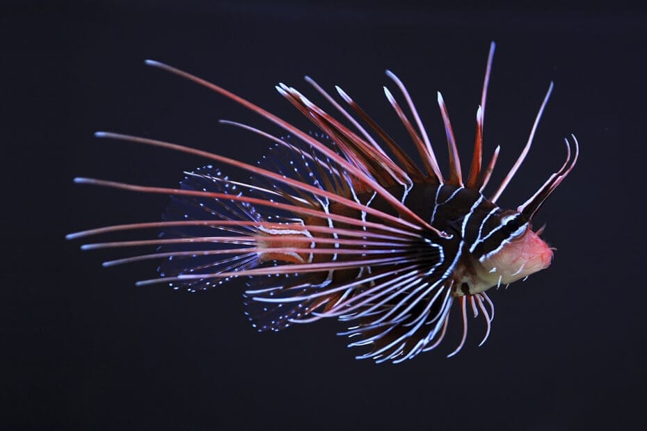 • Fins: Large, fan-like pectoral fins and tall, quill-like dorsal fins that are clear or translucent, distinguishing it from other lionfish species.