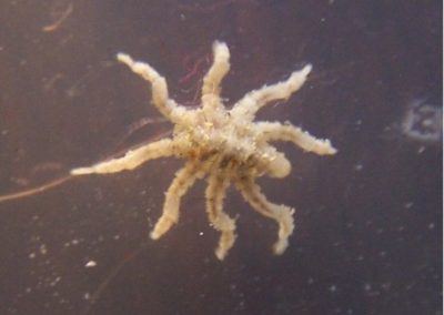- Tiny spider-like creatures visible under magnification, often on stalks or between polyps