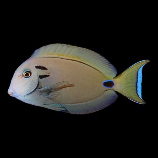 The Vampire Tang, also known as Tennent’s Surgeonfish, is a striking species with a grey body accented by a bold black face mask, yellow tail, and bright blue edging. It requires a large, mature reef aquarium with abundant swimming space and established rockwork for grazing. Like other surgeonfish, it can be aggressive toward similar tangs, so careful tankmate selection is important. Provide supplemental algae sheets to keep it well fed and healthy.